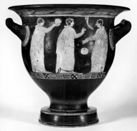 Keywords: Walters-Dresden Painter - Bell-Krater with Satyrs and Maenads and Three Draped Men - Walters 4875 - Side B.jpg This red-figure bell-krater depicts satyrs and maenads revelling on the front On the left a satyr wearing a fawn skin for a cloak and a wreath stands to the right; in his right hand he holds up a thyrsos from which an ivy vine hangs In front of him a maenad dances right looking around She wears a peplos girded at the waist bracelets earring wreath and possibly a necklace Over her head she holds a thyrsos in her right hand and in her left is a tympanum Next comes a satyr who goes right looking around He also wears a fawn skin for a cloak and a wreath His right arm is extended back over his head and in his left hand he holds a thyrsos On the right another maenad dances right looking around She wears a peplos diadem earring necklace bracelets and wreath and holds a ribbon between her hands Rocks and foliage fill out the scene On the back are three mantled youths two to the right and the third to the left The first holds a circular object possibly a aryballos in his extended right hand The one in the center gestures withhis right hand The third holds an aryballos by a string in his extended right hand A strigil hangs by his head The last two wear fillets Revelling satyrs and maenads is a popular subject at this time and similarly posed dancing figures are common ca 390 380 BC late Classical terracotta with handles cm 33 6 34 7 h x diam ; at mout cm 34 2 diam ; at foot cm 17 1 diam accession number 48 75 30808 Don Marcello Massarenti Collection Rome cat no 195 Henry Walters city Baltimore Walters Art Museum Henry Walters Acquired by Henry Walters with the Massarenti Collection 1902 place of origin Attica Greece Walters Art Museum license Ancient Greek red-figure pottery in the Walters Art Museum Media contributed by the Walters Art Museum needs category review Walters-Dresden Painter Media contributed by the Walters Art Museum needs artist update |