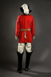 | Keywords: Walther von Hallwyls ordensdräkt som Rechtsritter i Johanniterorden bestående av flera delar - Hallwylska museet - 85850.tif JOHANNITERORDENSDRÄKTER <br/><br/>Bestående av delar av ordensdräkt för Ehrenritter samt ordensdräkt för Rechtsritter Delar av ordensdräkt för Ehrenritter Bestående av hatt epåletter med fodral värja med balja samt ett par sporrar <br/><br/>Hatt Av svart silkesfelb på styv stomme Trekantig vitplymascherad Agraff av guldbuljoner bestående av två spirallindade kantiljer lagda med krus den ena av förgylld rund metalltråd massiv den andra av oförgylld platt dylik tråd guldlan samt med en förgylld knapp med ordenskorset i silver Foder av vitt siden merveilleux Mått Vidd 56 cm Brätte längd 10 5 cm Epåletter axelstycken ett par med fodral Av metall i form av en oval skiva med rektangulär platt flik med fasade hörn Skivans sidor med stoppning Epålettens översida överklädd med guldtyg undersidan med röd ylleflanell På flikens översida en förgylld knapp med ordenskorset i vit emalj avnött på undersidan en mycket lång hake av mässing Axelholk av papp insidan överklädd med höggul sammet; på utsidan tätt vertikalt liggande guldbuljoner hårt dubbeltvinnade kantiljer Mått Längd 16 cm ; höjd 8 cm Fodral Av papp med trycklock samt på utsidan klätt med mörkt blågrönt knottrigt papper 8-formigt Locket fodrat med ljust blågrönt moirépapper lockets och fodralets kanter med likafärgat slätt papper Fodralets botten och sidor inuti vadderade samt fodrade med ljusgult fyrskaftat bomullstyg Under botten mörkblått papper Mått Höjd 10 cm ; längd 32 cm ; bredd 19 cm Värja med balja Klinga av stål blankpolerad tveeggad jämnt avsmalnande mot udden med sexsidigt tvärsnitt plana sidor och spetsig udd På klingans övre del i blankt mot mattetsad botten på vardera sidan akantusbladorneringar i tre grupper den övre och den nedre med en trofégrupp dessutom på mellersta gruppen på insidan preussiska örnen jämte ett i S-form gående skriftband varpå MIT GOTT F KÖNIG U VATERLAND Fäste av förgylld mässing Parerplåt hjärtformig skålig med bred ytterkant samt med den spetsiga ändan uppsvängd Mellan klingan och parerplåten två röda yllelappar Handbygel bågformig med ovalt tvärsnitt samt med nedre änden fortsättande på den bygeln motsatta sidan i en kort parerstång med tvär ytterände och avsmalnande inåt Kavel av trä spolformig med ovalt tvärsnitt samt lindad med höger- och vänstertvinnad grövre och finare tråd av silver Knapp långsträckt päronformig med övre ändan avslutad i en platt ändknapp på insvängd hög hals; på knappens utsida fritt pålagt i silver ordenskorset Mått Längd 0 95 m Klinga bredd vid fästet 1 5 cm Fäste längd 13 9 cm Balja Av svartlackerat läder med munbleck och släpsko av förgylld mässing Längs baksidan en grov spannad söm Munbleck och släpsko släta det förstnämnda med snett utvikt mynningskant samt på framsidan en nedåtriktad lång hake avsmalnande nedåt Mått Längd 0 81 m ; bredd 2 2 cm Munbleck längd 9 2 cm Släpsko längd 11 5 cm Sporrar spännsporrar ett par Av förgylld mässing Bygeln klackbågen med något uppsvängda skänklar trefasad utsida och platt insida samt avsmalnande utåt på vardera ändan en kullrig knapp på rakt utstående lång rundstavig hals Remmar saknas Mått Längd 12 5 cm ; bredd 10 9 cm Ordensdräkt för Rechtsritter Bestående av hatt mantel vapenrock livrem med gehäng värja med balja ordensband byxor stövlar sporrar med vristskydd block samt koffert med nycklar och överdrag Hatt Av svart styv filt med på sidorna uppviket brätte kantat med ett svart sidenmoiréband samt uppåt avsmalnande platt hög kulle nedtill denna en tjock snodd av förgylld metalltråd baktill med två öglor samt två tofsar av guldbuljoner tofshuvudet horisontalt lindat med dylika buljoner Framtill en vit och en svart lång strutsplym liggande över kullen och fäst under en kokard av hoprynkat svart sidenmoiréband varpå ordenskorset av vitt linnetyg Foder av vitt siden merveilleux ; svettrem av ljust beigefärgat getskinn baktill med en rosett av silkestrikåband i samma färg Mått Vidd 57 cm Kulle höjd 14 5 cm Brätte bredd 10 5 cm Mantel Av svart siden taft Hand- och maskinsydd Rektangulär i tre raka våder Övre kortsidan med fyra täta rynkrader utom på ett stycke vid vardera framkanten Foder av tunnare svart siden taft isytt med snoddade ytterkanter Halslinning smal dubbelviken Mått Längd 150 cm ; halsvidd 50 cm Vapenrock Av scharlakansrött kläde med knappar av förgylld koppar Livskuren tvåradig med tre par knappar Framstyckenas kanter passpoaler av vitt kläde Axelklaffar flätade av galonband i guld och med ordenskorset samt fodrade med rött kläde Krage rockslag ärmuppslag jämte skörtklaffar av vitt kläde Krage hög dubbelviken rockslag stora tresidiga ärmuppslag höga skörtklaffar konturerade de senare vardera med tre knappar jämte en smal guldgalon de övriga med en bred och en smal dylik Knappar runda kupiga med ordenskorset i relief baksidan av vit metall med en rundstavig ögla På vänstra framstycket en kort horisontal uppslitsning med fällklaff för värjan därovanför fyra horisontala silkesstränsar ordensfästen Foder av vitt siden i detsamma under vardera bakskörtet en ficka Mått Ärmhålsdjup 23 cm ; livlängd 42 cm ; längd hel 76 cm ; ryggbredd halv 18 cm ; ärmlängd 78 cm ; bröstvidd fram 44 cm ; bröstvidd hel 100 cm ; livvidd 90 cm Livrem med spänne och värjgehäng Remmen av grovt läder på utsidan ett pålagt band vävt av fina guldtrådar bildande fem längdgående flacka stavar omväxlande med smala ränder i hålmönster; insidan fodrad med rött kläde; remmens ena ände trubbvinklig på denna en fyrsidig sölja av mässing fastsydd med en kort läderflik samt avsedd för en på livremmens insida befintlig smal rem med mörkröd utsida och nio spännhål samt med innerändan