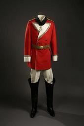 | Keywords: Walther von Hallwyls ordensdräkt som Rechtsritter i Johanniterorden bestående av flera delar - Hallwylska museet - 85852.tif JOHANNITERORDENSDRÄKTER <br/><br/>Bestående av delar av ordensdräkt för Ehrenritter samt ordensdräkt för Rechtsritter Delar av ordensdräkt för Ehrenritter Bestående av hatt epåletter med fodral värja med balja samt ett par sporrar <br/><br/>Hatt Av svart silkesfelb på styv stomme Trekantig vitplymascherad Agraff av guldbuljoner bestående av två spirallindade kantiljer lagda med krus den ena av förgylld rund metalltråd massiv den andra av oförgylld platt dylik tråd guldlan samt med en förgylld knapp med ordenskorset i silver Foder av vitt siden merveilleux Mått Vidd 56 cm Brätte längd 10 5 cm Epåletter axelstycken ett par med fodral Av metall i form av en oval skiva med rektangulär platt flik med fasade hörn Skivans sidor med stoppning Epålettens översida överklädd med guldtyg undersidan med röd ylleflanell På flikens översida en förgylld knapp med ordenskorset i vit emalj avnött på undersidan en mycket lång hake av mässing Axelholk av papp insidan överklädd med höggul sammet; på utsidan tätt vertikalt liggande guldbuljoner hårt dubbeltvinnade kantiljer Mått Längd 16 cm ; höjd 8 cm Fodral Av papp med trycklock samt på utsidan klätt med mörkt blågrönt knottrigt papper 8-formigt Locket fodrat med ljust blågrönt moirépapper lockets och fodralets kanter med likafärgat slätt papper Fodralets botten och sidor inuti vadderade samt fodrade med ljusgult fyrskaftat bomullstyg Under botten mörkblått papper Mått Höjd 10 cm ; längd 32 cm ; bredd 19 cm Värja med balja Klinga av stål blankpolerad tveeggad jämnt avsmalnande mot udden med sexsidigt tvärsnitt plana sidor och spetsig udd På klingans övre del i blankt mot mattetsad botten på vardera sidan akantusbladorneringar i tre grupper den övre och den nedre med en trofégrupp dessutom på mellersta gruppen på insidan preussiska örnen jämte ett i S-form gående skriftband varpå MIT GOTT F KÖNIG U VATERLAND Fäste av förgylld mässing Parerplåt hjärtformig skålig med bred ytterkant samt med den spetsiga ändan uppsvängd Mellan klingan och parerplåten två röda yllelappar Handbygel bågformig med ovalt tvärsnitt samt med nedre änden fortsättande på den bygeln motsatta sidan i en kort parerstång med tvär ytterände och avsmalnande inåt Kavel av trä spolformig med ovalt tvärsnitt samt lindad med höger- och vänstertvinnad grövre och finare tråd av silver Knapp långsträckt päronformig med övre ändan avslutad i en platt ändknapp på insvängd hög hals; på knappens utsida fritt pålagt i silver ordenskorset Mått Längd 0 95 m Klinga bredd vid fästet 1 5 cm Fäste längd 13 9 cm Balja Av svartlackerat läder med munbleck och släpsko av förgylld mässing Längs baksidan en grov spannad söm Munbleck och släpsko släta det förstnämnda med snett utvikt mynningskant samt på framsidan en nedåtriktad lång hake avsmalnande nedåt Mått Längd 0 81 m ; bredd 2 2 cm Munbleck längd 9 2 cm Släpsko längd 11 5 cm Sporrar spännsporrar ett par Av förgylld mässing Bygeln klackbågen med något uppsvängda skänklar trefasad utsida och platt insida samt avsmalnande utåt på vardera ändan en kullrig knapp på rakt utstående lång rundstavig hals Remmar saknas Mått Längd 12 5 cm ; bredd 10 9 cm Ordensdräkt för Rechtsritter Bestående av hatt mantel vapenrock livrem med gehäng värja med balja ordensband byxor stövlar sporrar med vristskydd block samt koffert med nycklar och överdrag Hatt Av svart styv filt med på sidorna uppviket brätte kantat med ett svart sidenmoiréband samt uppåt avsmalnande platt hög kulle nedtill denna en tjock snodd av förgylld metalltråd baktill med två öglor samt två tofsar av guldbuljoner tofshuvudet horisontalt lindat med dylika buljoner Framtill en vit och en svart lång strutsplym liggande över kullen och fäst under en kokard av hoprynkat svart sidenmoiréband varpå ordenskorset av vitt linnetyg Foder av vitt siden merveilleux ; svettrem av ljust beigefärgat getskinn baktill med en rosett av silkestrikåband i samma färg Mått Vidd 57 cm Kulle höjd 14 5 cm Brätte bredd 10 5 cm Mantel Av svart siden taft Hand- och maskinsydd Rektangulär i tre raka våder Övre kortsidan med fyra täta rynkrader utom på ett stycke vid vardera framkanten Foder av tunnare svart siden taft isytt med snoddade ytterkanter Halslinning smal dubbelviken Mått Längd 150 cm ; halsvidd 50 cm Vapenrock Av scharlakansrött kläde med knappar av förgylld koppar Livskuren tvåradig med tre par knappar Framstyckenas kanter passpoaler av vitt kläde Axelklaffar flätade av galonband i guld och med ordenskorset samt fodrade med rött kläde Krage rockslag ärmuppslag jämte skörtklaffar av vitt kläde Krage hög dubbelviken rockslag stora tresidiga ärmuppslag höga skörtklaffar konturerade de senare vardera med tre knappar jämte en smal guldgalon de övriga med en bred och en smal dylik Knappar runda kupiga med ordenskorset i relief baksidan av vit metall med en rundstavig ögla På vänstra framstycket en kort horisontal uppslitsning med fällklaff för värjan därovanför fyra horisontala silkesstränsar ordensfästen Foder av vitt siden i detsamma under vardera bakskörtet en ficka Mått Ärmhålsdjup 23 cm ; livlängd 42 cm ; längd hel 76 cm ; ryggbredd halv 18 cm ; ärmlängd 78 cm ; bröstvidd fram 44 cm ; bröstvidd hel 100 cm ; livvidd 90 cm Livrem med spänne och värjgehäng Remmen av grovt läder på utsidan ett pålagt band vävt av fina guldtrådar bildande fem längdgående flacka stavar omväxlande med smala ränder i hålmönster; insidan fodrad med rött kläde; remmens ena ände trubbvinklig på denna en fyrsidig sölja av mässing fastsydd med en kort läderflik samt avsedd för en på livremmens insida befintlig smal rem med mörkröd utsida och nio spännhål samt med innerändan