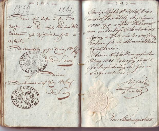 Keywords: Wanderbuch journeyman Wobrausky from Daschitz 23.jpg Wanderbuch eines Kürschner-Gesellen Wanderbuch in Folge allerhöchsten Patents vom 24 Februar 1827 Für Anton Wobrausky von Daschitz aus Böhmen Chrudimer Kreis Seite 46-47 Wandrownická knizka die nevwysssjho patentu ob 24 vnora 1827 Travelling book of a Czechoslovakian furrier Page 46-47 from own possession 1827 First notice 18 März 1832 Last notice 8 August 1848 --Kürschner <span class signature-talk >talk</span> 20 10 19 February 2009 UTC thumb thumb thumb thumb See also/siehe auch Kürschner Wanderbücher PD-old Wanderbuch des Kürschner-Gesellen Wobrausky aus Daschitz |