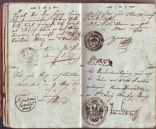 Keywords: Wanderbuch journeyman Wobrausky from Daschitz 11.jpg Wanderbuch eines Kürschner-Gesellen Wanderbuch in Folge allerhöchsten Patents vom 24 Februar 1827 Für Anton Wobrausky von Daschitz aus Böhmen Chrudimer Kreis Seite 22-23 Wandrownická knizka die nevwysssjho patentu ob 24 vnora 1827 Travelling book of a Czechoslovakian furrier Page 22-23 from own possession 1827 First notice 18 März 1832 Last notice 8 August 1848 --Kürschner <span class signature-talk >talk</span> 20 30 18 February 2009 UTC thumb thumb thumb thumb See also/siehe auch Kürschner Wanderbücher PD-old Furs literature German Wanderbuch des Kürschner-Gesellen Wobrausky aus Daschitz