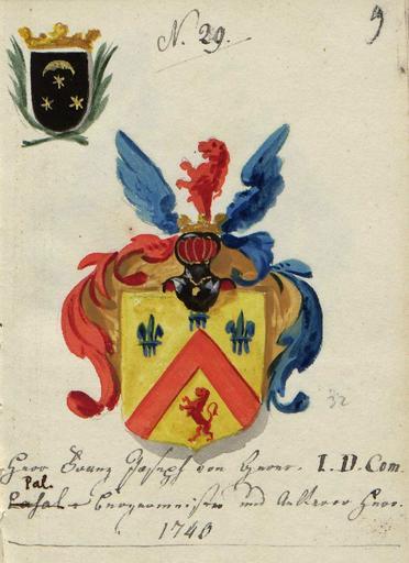 Keywords: Wappenbuch RV 18Jh 19r Gerer.jpg Wappenbuch der adeligen Gesellschaft zu Ravensburg UB Augsburg “ Oettingen-Wallersteinsche Bibliothek Cod I 7 8 2 fol 19r Franz Joseph von Gerer 1688 in à berlingen; Dr jur ; 1718 Kanzleiverwalter in Ravensburg; 1722 Stadtsyndikus; 1736 nobilitiert siehe auch File Alberti Wappenbuch H04 S 0222 jpg oben Wappen der Ehefrau laut Dreher Patriziat S 531 Maria Salomäa Zelling Heirat 1721; siehe auch Wappen Zelling File Wappenbuch RV 18Jh 29r Zelling jpg http //www nbn-resolving de/urn nbn de bvb 384-uba002026-1 between 1738 1780 anonymous PD-old-100-1923 Wappenbuch der adeligen Gesellschaft zu Ravensburg Coats of arms of families of Germany - G Gerer Coats of arms of Zelling family |