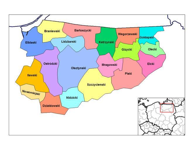 Keywords: Warminsko-Mazurskie powiaty.png Map of the powiat ziemski land counties without powiat grodzki Independent cities of Warmian-Masurian voivodeship województwo warmińsko-mazurskie in Poland Created by Rarelibra 22 29 2 January 2007 UTC for public domain use using MapInfo Professional v8 5 and various mapping resources 2007-01-02 own assumed Rarelibra Administrative units of Poland Maps of Warmian-Masurian Voivodeship |