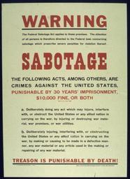 Keywords: "WARNING...SABOTAGE. THE FOLLOWING ACTS, AMONG OTHERS, ARE CRIMES AGAINST THE UNITED STATES...TREASON IS PUNISHABLE... - NARA - 516041.tif Scope and content General notes 516041 Local identifier 44-PA-2315 Office for Emergency Management Office of War Information Domestic Operations Branch Bureau of Special Services 03/09/1943 - 09/15/1945 Still Picture Records Section Special Media Archives Services Division NWCS-S National Archives at College Park 8601 Adelphi Road College Park MD 20740-6001 1941 - 1945 Record group Record Group 44 Records of the Office of Government Reports 1932 - 1947 Record group ARC 373 World War II Posters compiled 1942 - 1945 Series ARC 513498 File unit File unit ARC Variant control numbers NAIL Control Number NWDNS-44-PA-2315 yes Other versions <gallery> File WARNING SABOTAGE _THE_FOLLOWING_ACTS _AMONG_OTHERS _ARE_CRIMES_AGAINST_THE_UNITED_STATES TREASON_IS_PUNISHABLE _-_NARA_-_516041 tif tif File WARNING SABOTAGE _THE_FOLLOWING_ACTS _AMONG_OTHERS _ARE_CRIMES_AGAINST_THE_UNITED_STATES TREASON_IS_PUNISHABLE _-_NARA_-_516041 jpg jpg </gallery> NARA-cooperation PD-USGov World War II posters from the United States Sabotage NARA TIF images with categorized JPGs |