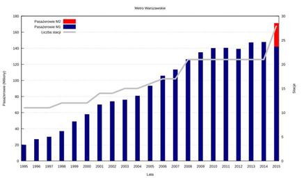 | Keywords: Warsaw-Metro-Passengers-pl.svg Metro warszawskie liczba pasażerów i stacji http //www metro waw pl/pliki/aktualnosci/2016/rr2015/rr2015 pdf Raport Roczny Metra Warszawskiego 2015 File talk Warsaw-Metro-Passengers-en svg zawiera dane i skrypt gnuplot Sliwers 2016-10-30 File Warsaw-Metro-Passengers-en svg Created with Gnuplot Metro in Warsaw “ charts |