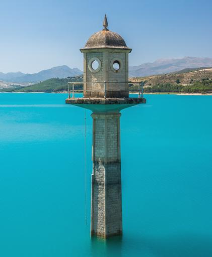 Keywords: watchtower lake turquoise water lighthouse impoundment dam spain basin mountains hills trees landscape architecture building old tower cc0