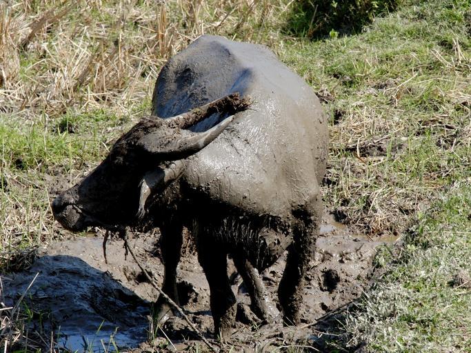 Keywords: water buffalo animal buffalo asia cambodia nature watering hole mammals mud mud hole horns dirty