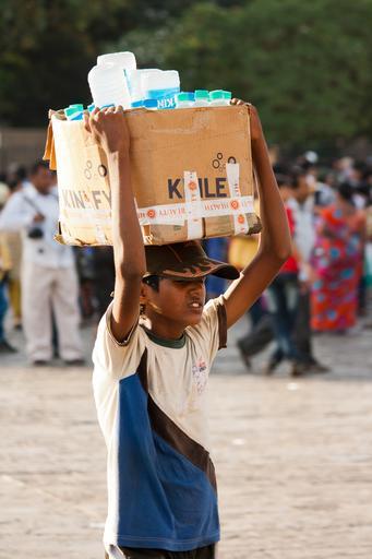 Keywords: water seller india boy head carry box people asia vendor hard work labor