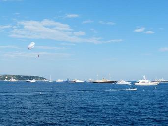 Keywords: water sports parasailing screen drag fly pull up yachts controllable parachuting high parachute bird's eye view paragliding hang gliding sky blue paraglider sport hobby airy personal human pair boats ships