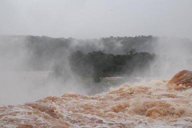 Keywords: waterfall churning tumultuous mist rough water dangerous brown nature flowing argentina iguazu