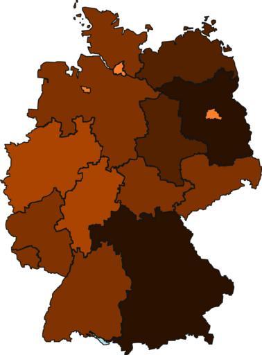 Keywords: Watts per capita Germany.svg en German photovoltaic capacity in 'watts per capita' by federal states First version as of the end of 2013 http //www webcitation org/6QGSvAF7w Source data from www epia org Global Market Outlook for Photovoltaics 2014-2018 page 24 PDF-file FF7F2A 1px solid D45500 10 ”50 watts per habitant FF6600 1px solid AA4400 50 ”100 watts per habitant D45500 1px solid 803300 100 ”200 watts per habitant AA4400 1px solid 803300 200 ”350 watts per habitant 803300 1px solid 803300 350 ”500 watts per habitant 552200 1px solid 552200 500 ”750 watts per habitant 2B1100 1px solid 2B1100 >750 watts per habitant 2014-06-15 20 35 14 own Valid SVG margin 5px 0; inkscape Rfassbind Cartograms of Europe Cartograms European Photovoltaics