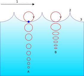 MAKE A MEME View Large Image Wave motion-i18n.svg en A particle motion in an ocean wave A At deep water <br> B At shallow water The circular movement of a surface particle becomes eliptical with increasing depth<br> 1 Progression of wave<br> 2 Crest<br> 3 Trough en ...