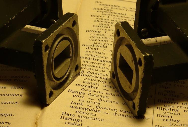 Keywords: Waveguide-choke-flange-UG-1666-U.jpg en Waveguide choke flange UG-1666/U so that's on WG18 and is aluminium and matching gasket/cover flange This is a composite picture because these flanges are on opposite ends of the same device a Moreno crossguide coupler and I didn't want to saw it in half The book is Ю В Катышев Д Л овиков Э А Полфе ов editor В П Дмит иевского «Англо-Русский Слова ь по уско ителям за яженных частиц» The E-plane cross-section of the assembled joint is shown in File Waveguide-choke-flange-cross-section svg own Catslash 2009-07-25 Waveguide flanges