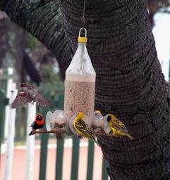 Keywords: weaver birds feeder seed cola bottle recycled red yellow tropical birds fly feathers nature wild wildlife