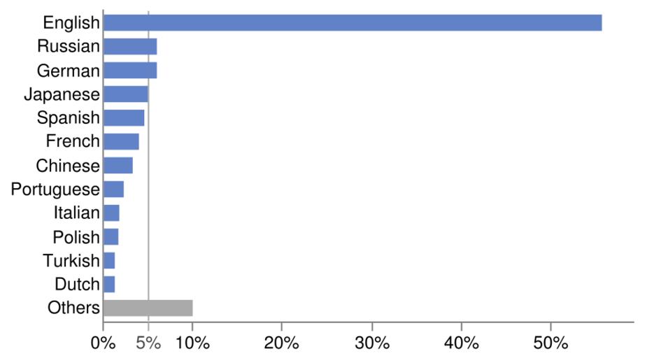 | Keywords: WebsiteContentLanguages.svg en Bar chart showing the top languages of website users 2014-03-12 21 28 59 own based on data from Usage of content languages for websites W3Techs com a division of Q-Success DI Gelbmann GmbH URL http //w3techs com/technologies/overview/content_language/all <br/> ValidSVG Xan Gregg Data from the W3Techs com website may be reused provided that a reference is included with at least the names of the Web site and page because information on the W3Techs website changes frequently a date the URL of the page and where feasible a link to the original page File WebsitesByLanguagePieChart svg cc-zero Uploaded with UploadWizard Languages Internet access Information technology and development Internet language statistics |