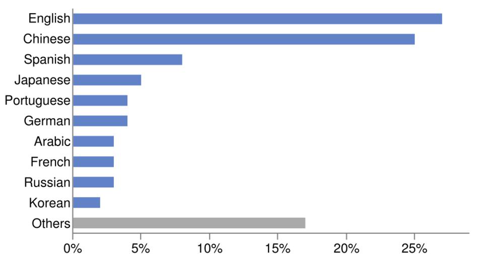 | Keywords: WebsiteUserLanguageBars.svg en Bar chart showing the top languages of website users 2014-03-12 21 28 59 own based on data from https //en wikipedia org/wiki/Languages_used_on_the_Internet <br/> ValidSVG Xan Gregg File InternetUsersByLanguagePieChart svg cc-zero Uploaded with UploadWizard Languages Internet access Information technology and development Internet language statistics | ||||