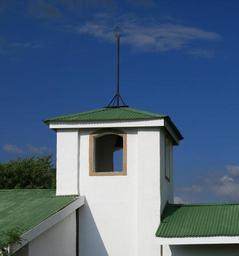 Keywords: wedding chapel building blue sky whispy cloud green roof tops white walls white tower high window opening