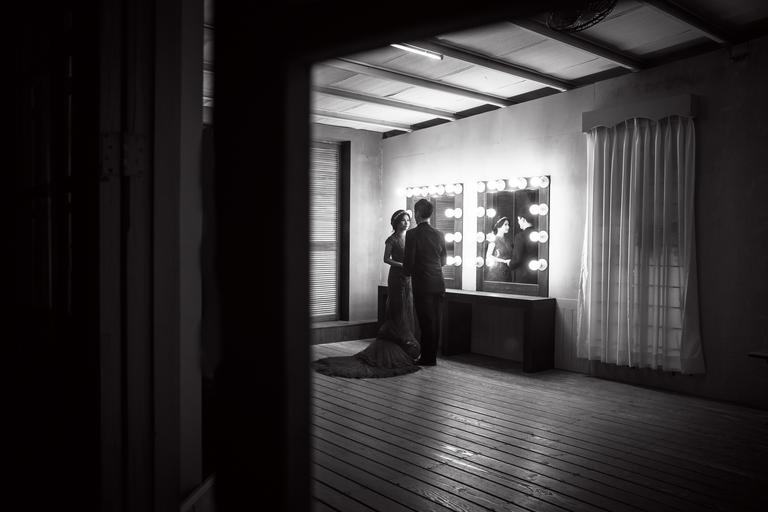 Keywords: wedding dress dresser black and white photo wood flooring