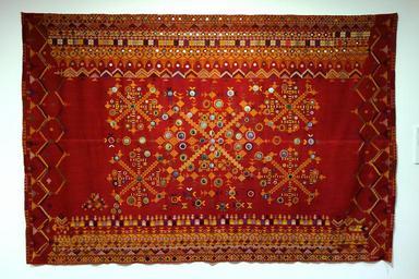 | Keywords: Wedding shawl (odhani), Barmer, Rajasthan, India, view 1, mid 20th century, cotton, silk, glass mirrors - Textile Museum of Canada - DSC00982.JPG en Exhibit in the Textile Museum of Canada 55 Centre Avenue Toronto Ontario Canada Photography was permitted in the museum without restriction 2013-07-04 14 21 34 own Daderot cc-zero Textiles in the Textile Museum of Canada Uploaded with UploadWizard Barmer district Crafts of Rajasthan | ||||