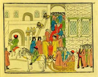 Keywords: Wedding of tsar Michael7.jpeg То жественный вход в Г ановитую палату после венчания Г авю а аква ель 1810 По о игиналу последней т ети XVII в http //historydoc edu ru/catalog asp cat_ob_no 15623 ob_no 16177 1810 По о игиналу последней т ети XVII в Author Wedding of Michael I of Russia Files uploaded by Shakko from various sources PD-Art |