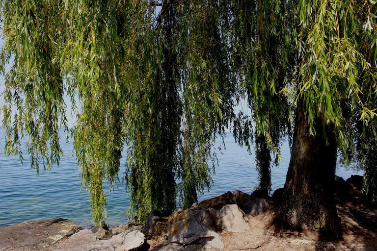 Keywords: weeping willow tree atmosphere lake bank stones lake constance rorschach switzerland