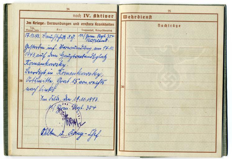 Keywords: Wehrpass 19.jpg LargeImage en The Wehrpass of Hermanm Kopp who died in Oktober 1943 on the eastern front de Der Wehrpass von Hermann Kopp welcher im Oktober 1943 an der Ostfront starb 2011-07-04 own Redwolf2 cc-zero Wehrpass Reichsadler of the Third Reich Nazi Germany Military history of Germany 1943 |
