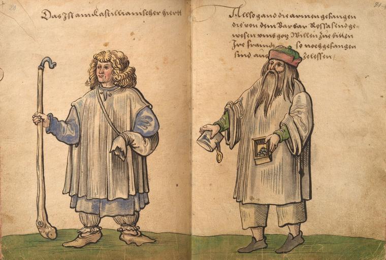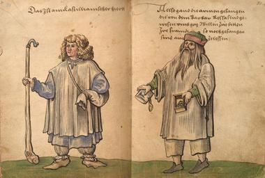 Keywords: Weiditz Trachtenbuch 020-021.jpg Trachtenbuch des Christoph Weiditz Germanisches Nationalmuseum Nürnberg Hs 22474 Bl 20 “21 Kastilianischer Hirt / Sammler von Lösegeld für die Gefangenen der Seeräuber http //dlib gnm de/item/Hs22474 manipuliert um das Buch in Doppelseiten anzuzeigen s 1530 Creator Christoph Weiditz PD-old-100 Trachtenbuch des Christoph Weiditz Medieval miniatures of shepherds Beggars in art People of Castile and León |