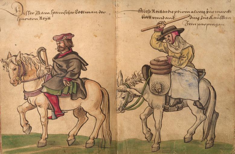 | Keywords: Weiditz Trachtenbuch 047-048.jpg Trachtenbuch des Christoph Weiditz Germanisches Nationalmuseum Nürnberg Hs 22474 Bl 47-48 Spanischer Edelmann auf einem Spazierritt / Zu Markt reitende Bäuerin in Perpignan http //dlib gnm de/item/Hs22474 manipuliert um das Buch in Doppelseiten anzuzeigen s 1530 Creator Christoph Weiditz PD-old-100 Trachtenbuch des Christoph Weiditz Riding in art People of Pyrénées-Orientales | ||||
