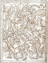 Keywords: Weigel 07.JPG Artist Gloriare Tu es firmus in fide Coronam meruisti Exalta teipsum In paciencia perseuerasta perseverasti ---- Schriftbänder Sei stolz Du bist stark im Glauben Du hast die Krone verdient Verherrliche dich selbst Du bist in Geduld geübt ---- Banderoles Be proud You are strong in faith You have earned the crown Exalt yourself Persevere in patience Five devils adulate sanctimoniously and offer crowns Mary Christ and God the Father attend the dying man along with saints Three small figures of saved souls at his eye level show that pride can be resisted own PD-old Other versions left thumb Ars moriendi |