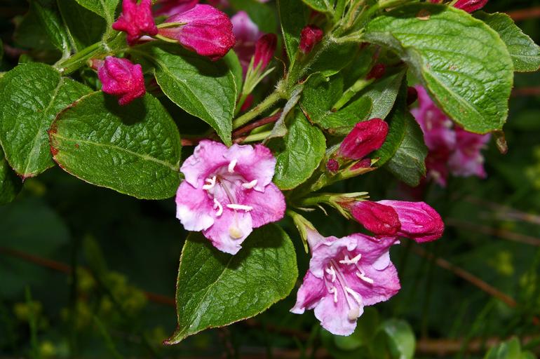 Keywords: weigela bush flowering shrub bi color garden flower bed pink flowering pink blossom bloom hedge flowering hedge garden design bud flower plant spring nature branch leaves bicolor leaves leaf green leaf structure pattern