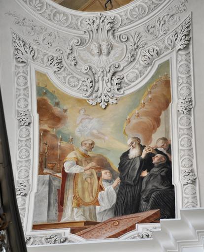 | Keywords: Weingarten Fresko Joch3 Benediktsleben Süd3.jpg Weingarten Württemberg Basilika St Martin und Oswald Fresken von Cosmas Damian Asam 1718 “1720<br /> Fresken im 3 Langhausjoch Thema Leben des hl Benedikt von Nursia; südliche Quertonne Benedikts Heimgang Benedikt lässt sein Grab vorbereiten; rechts Lichtstraße in den Himmel own own photograph 2011-03 Creator Cosmas Damian Asam Photo Andreas Praefcke Frescos in Basilika St Martin Weingarten Photos by User AndreasPraefcke Frescos of Benedict of Nursia |