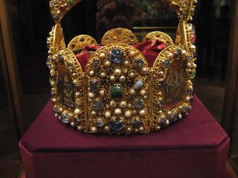 | Keywords: Weltliche Schatzkammer Wien (170).JPG Die Reichskrone Westdeutsch 2 H 10 Jahrhundert; das Kronenkreuz einer Hinzufügung des frühen 11 Jahrhunderts; der Bügel aus der Zeit Kaiser Konrads II 1024-1039 ; die rote Samthaube aus dem 18 Jahrhundert Gold Email Zellenschmelz Edelsteine Perlen Stirnplatte H 14 9 cm B 11 2 cm ; Kronenkreuz H 9 9 cm SK Inv -Nr XIII 1 The Imperial Crown Western Germany 2nd half of the 10th century The cross is an addition from the early 11th century; the arch dates from the reign of Emperor Conrad II ruled 1024-1039 ; the red velvet cap is from the 18th century Gold cloisonné enamel precious stones pearls Brow plate H 14 9 cm W 11 2 cm; cross H 9 9 cm SK Inv No XIII 1 Own 2007-10 MyName Gryffindor part of panorama Weltliche Schatzkammer Wien 171 pano jpg Secular and Ecclesiastical Treasury |