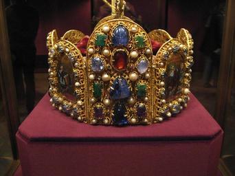 | Keywords: Weltliche Schatzkammer Wien (177).JPG Die Reichskrone Westdeutsch 2 H 10 Jahrhundert; das Kronenkreuz einer Hinzufügung des frühen 11 Jahrhunderts; der Bügel aus der Zeit Kaiser Konrads II 1024-1039 ; die rote Samthaube aus dem 18 Jahrhundert Gold Email Zellenschmelz Edelsteine Perlen Stirnplatte H 14 9 cm B 11 2 cm ; Kronenkreuz H 9 9 cm SK Inv -Nr XIII 1 The Imperial Crown Western Germany 2nd half of the 10th century The cross is an addition from the early 11th century; the arch dates from the reign of Emperor Conrad II ruled 1024-1039 ; the red velvet cap is from the 18th century Gold cloisonné enamel precious stones pearls Brow plate H 14 9 cm W 11 2 cm; cross H 9 9 cm SK Inv No XIII 1 Own 2007-10 MyName Gryffindor 100px 100px 100px part of panorama Weltliche_Schatzkammer_Wien_ P02 jpg Secular and Ecclesiastical Treasury |