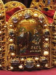 | Keywords: Weltliche Schatzkammer Wien (196).JPG Ezechias Hiskia mit dem Propheten Jesaja Die Reichskrone Westdeutsch 2 H 10 Jahrhundert; das Kronenkreuz einer Hinzufügung des frühen 11 Jahrhunderts; der Bügel aus der Zeit Kaiser Konrads II 1024-1039 ; die rote Samthaube aus dem 18 Jahrhundert Gold Email Zellenschmelz Edelsteine Perlen Stirnplatte H 14 9 cm B 11 2 cm ; Kronenkreuz H 9 9 cm SK Inv -Nr XIII 1 Hezekiah with the prophet Isaiah The Imperial Crown Western Germany 2nd half of the 10th century The cross is an addition from the early 11th century; the arch dates from the reign of Emperor Conrad II ruled 1024-1039 ; the red velvet cap is from the 18th century Gold cloisonné enamel precious stones pearls Brow plate H 14 9 cm W 11 2 cm; cross H 9 9 cm SK Inv No XIII 1 Own 2007-10 MyName Gryffindor Imperial Crown of the Holy Roman Empire Isaiah Hezekiah Secular and Ecclesiastical Treasury |