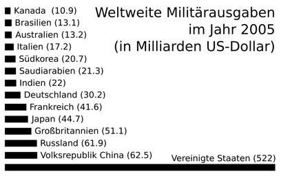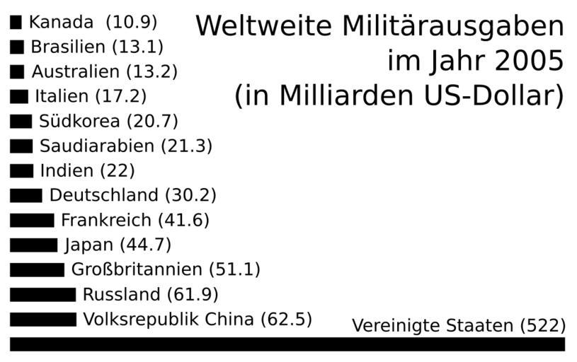 | Keywords: Weltweite Militärausgaben 2005.svg  150px thumb Vertical version Graphic showing the top 14 worldwide military budgets sorted by country the top 14 cover all countries who spent more than 10 billion on their military in USD billions Data for P R China and Russia is from 2004 expenditures Expenditures are used in a few cases where official budgets are significantly lower than actual spending Data source http //www armscontrolcenter org/archives/002244 php Center for Arms Control and Non-Proliferation Created by User Fastfission using a combination of Microsoft Excel to get the bars the right length then exported to Illustrator and then re-designed in Inkscape Not all exact values are shown the goal of the graphic is to show relative amounts and not just duplicate what could otherwise more easily go into a table I've arranged it vertically in order to best work with Wikipedia page layout I've tried to keep things pretty simple following the graphical recommendations that Edward Tufte has written about There is also a vertical version without the title on it Image Worldwide military spending 2005 svg Worldwide_military_spending_2005_ horizontal svg 2008-06-25 07 39 UTC derivative work of User Fastfission changed by User Rabenkind Worldwide_military_spending_2005_ horizontal svg User Fastfission deutsche bezeichnungen Rabenkind Worldwide_military_spending_2005_ horizontal svg Rabenkind original upload log This image is a derivative work of the following images Image Worldwide_military_spending_2005_ horizontal svg licensed with PD-user 2006-12-31T19 47 31Z Fastfission 296x186 47682 Bytes <nowiki>slight alignment change</nowiki> 2006-12-31T19 42 00Z Fastfission 296x186 47640 Bytes <nowiki>Graphic showing the top 14 worldwide military budgets sorted by country the top 14 cover all countries who spent more than 10 billion on their military in USD billions Data for P R China and Russia is from 2004 expen</nowiki> Uploaded with derivativeFX Military of Saudi Arabia Military of the United States Military diagrams |