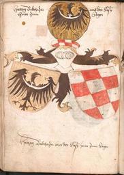| Keywords: Wernigeroder Wappenbuch 068.jpg žWernigeroder Schaffhausensches Wappenbuch ; Süddeutschland 4 Viertel 15 Jh <br />Bayerische Staatsbibliothek München Cod icon 308 n<br /> Wappen des Herzog Balthasar von Schlesien http //daten digitale-sammlungen de/~db/0004/bsb00043104/images/ circa 1475 “1500 anonymous PD-old Wernigeroder Wappenbuch Coats of arms of Duchy of Sagan Coats of arms of the House of Piast Balthasar of Zágán | ||||