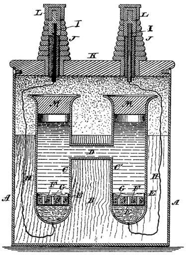 | Keywords: Westoncell Volt.png en Extracted from PDF revealing US patent 494 827 A Outer shell or casing made preferably of sheet brass elliptical in form B Wooden block containing cavities or recesses to receive the glass cells C C' C C' Glass cells consist of two cylindrical vessels connected by a transverse tube D E Piece of muslin or other suitable cloth F Cork pierced with apertures G H Connecting wires I Copper wires connected to H J Suitable binding posts provided with covering caps L K Cover of the shell A which is made of rubber M Suitable stoppers inserted in the mouths of the cell 2012-03-27 www google com/patents/US494827 pdf Edward Weston died 20-Aug-1936 <gallery showfilename> File Westoncell Volt jpg </gallery> PD-old Uploaded with UploadWizard Edward Weston chemist History of electric batteries |