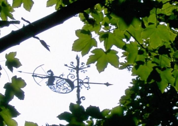Keywords: Wetterfahne.JPG Windrichtungsanzeiger auf dem dicken Turm von Schloss Wissen in 47652 Weeze / Wissen Germany ; fotografiert von mir selbst am heißen Nachmittag des 21 Juli 2006; schräg rechts hinter dem Bogenschützen ist vermutlich die Jahreszahl 1882 und darunter mit Sicherheit das Wappenzeichen der Familie von Loe zu sehen eine Krampe wie man sie zu Befestigung von Draht an einem Weidepfosten verwendet Photographer Lutz 2006-07-23 own assumed Hans-Robert Lutz Sculptures of archers Weather vanes in North Rhine-Westphalia Schloss Wissen |