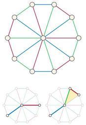 | Keywords: Wheel rainbow coloring.svg Rainbow coloring of a wheel graph with three colors Every two non-adjacent vertices can be connected by a rainbow path either directly through the center vertex bottom left or by detouring around one triangle to avoid a repeated edge color bottom right 2014-06-26 11 04 46 own David Eppstein cc-zero Uploaded with UploadWizard Graph coloring; edge Wheel graphs | ||||