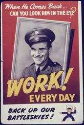 Keywords: When he comes back... Can you look him in the eye^ Work every day^ Back up our battleskies^ - NARA - 535127.tif Scope and content General notes 535127 Local identifier 179-WP-1276 Office for Emergency Management War Production Board 01/1942 - 11/03/1945 Still Picture Records Section Special Media Archives Services Division NWCS-S National Archives at College Park 8601 Adelphi Road College Park MD 20740-6001 other date circa 1942 1943 Record group Record Group 179 Records of the War Production Board 1918 - 1947 Record group ARC 508 War Production Board compiled 1942 - 1943 Series ARC 533858 File unit File unit ARC Variant control numbers NAIL Control Number NWDNS-179-WP-1276 yes Other versions <gallery> File When_he_comes_back _Can_you_look_him_in_the_eye _Work_every_day _Back_up_our_battleskies _-_NARA_-_535127 tif tif File When_he_comes_back _Can_you_look_him_in_the_eye _Work_every_day _Back_up_our_battleskies _-_NARA_-_535127 jpg jpg </gallery> NARA-cooperation PD-USGov World War II posters from the United States NARA TIF images with categorized JPGs |