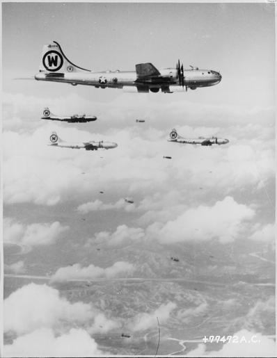 | Keywords: When members of the United Nations Forces moved north over the 38th Parallel into the well-known industrial cities... - NARA - 542199.tif Scope and content When members of the United Nations Forces moved north over the 38th Parallel into the well-known industrial cities they found gutted buildings and mounds of twisted steel that were formerly vital to Communistic Korea's military forces Targets such as the large marshalling yards of Pyongyang the oil refinery at Wonsan and the key Kan-ni Arsenal near Pyongyang are evidence of the efforts put forth by the U S Air Force B-29s flying the long air miles from bases in Japan and Okinawa Upon request from the United Nations bombardiers of the huge bombers paid close attention to pin-pointed military targets and left surrounding civilian homes and business sections almost untouched B-29s of the U S Air Force drop their 500-pound bombs on a strategic target in North Korea These planes have devastated enemy North Korean supply lines industrial areas and troop concentrations with their precision bombing General notes 542199 Local identifier 342-AF-77472AC Department of Defense Department of the Air Force 09/26/1947 - Still Picture Records Section Special Media Archives Services Division NWCS-S National Archives at College Park 8601 Adelphi Road College Park MD 20740-6001 ca date 1950 09 13 Record group Record Group 342 Records of U S Air Force Commands Activities and Organizations 1900 - 2003 Record group ARC 654 Black and White Photographs of U S Air Force and Predecessors' Activities Facilities and Personnel Domestic and Foreign compiled 1930 - 1975 documenting the period 1863 - 1975 Series ARC 542185 File unit File unit ARC Variant control numbers Agency-Assigned Identifier NASM 4A 38425<br /> NAIL Control Number NWDNS-342-AF-77472AC yes Other versions NARA-cooperation PD-USGov 1950 in Korea Bombing during the Korean War B-29s in the Korean War History of the United Nations |