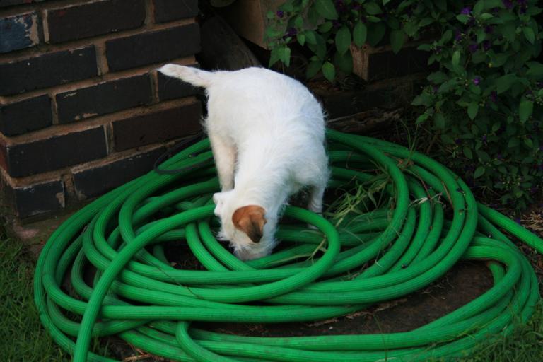Keywords: white dog dog white parson's jack russell terrier sniffing hose green