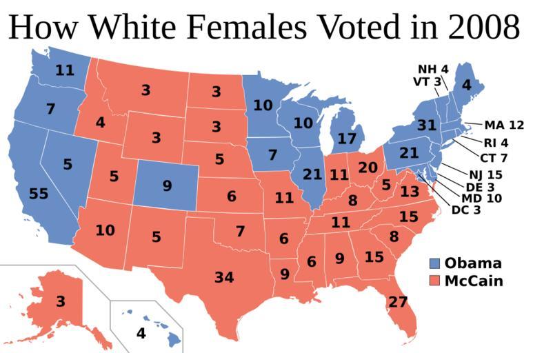 Keywords: White Female Vote 2008.svg en White female vote in 2008 by exit polling own Inoljt 2010-05-19 2008 U S presidential election maps state subdivisions