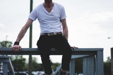 Keywords: white tshirt vneck fashion guy man people lifestyle sitting pants belt