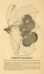 | Keywords: Wholesale catalogue of fruit, evergreen and ornamental trees shrubs, roses, greenhouse plants, etc. for the autumn of 1880 and spring 1881 (16446895514).jpg From Journal of Horticulture <br> SCHMIDT'S BIB <br> Price ” 1 year 30 Cts each 3 00 per doz 2 years 40 cts each <br> This noble Cherry was introduced into England by Mr Rivers under the name <br> of Bigarreau Noir de Schmidt who has not been able to trace its history beyond <br> the Societe Van Mons of Belgium from which he received it It is by far the <br> largest of all the Black Bigarreau Cherries <br> As will be seen from our engraving the fruit is produced in clusters and is of a <br> large size round and somewhat oblate The skin is of a deep black color and <br> there is a large style mark on the apex The stalk is stout 2 inches long and <br> rather deeply inserted; flesh dark tender and very juicy with a fine flavor The <br> stone is very small for the size of the fruit 42383909 134007 66736 Text http //www biodiversitylibrary org/page/42383909 1880 10 5962/bhl title 66736 Henry G Gilbert Nursery and Seed Trade Catalog Collection ; John Saul Firm Washington D C Biodiversity Heritage Library Wholesale catalogue of fruit evergreen and ornamental trees shrubs roses greenhouse plants etc for the autumn of 1880 and spring 1881 Catalogs Flowers Nurseries Horticulture Plants Seeds U S Department of Agriculture National Agricultural Library bhl page 42383909 dc identifier http //biodiversitylibrary org/page/42383909 bhlGardenStories Schmidt's bigarreau nurseries horticulture u s department of agriculture national agricultural library bhlgardenstories Information field Flickr posted date ISOdate 2015-04-07 CC-BY-2 0 BioDivLibrary https //flickr com/photos/61021753 N02/16446895514 2015-08-23 19 55 01 cc-by-2 0 PD-old-70-1923 Wholesale catalogue of fruit evergreen and ornamental trees shrubs roses greenhouse plants etc for the autumn of 1880 and spring 1881 Photos uploaded from Flickr by Fæ using a script |