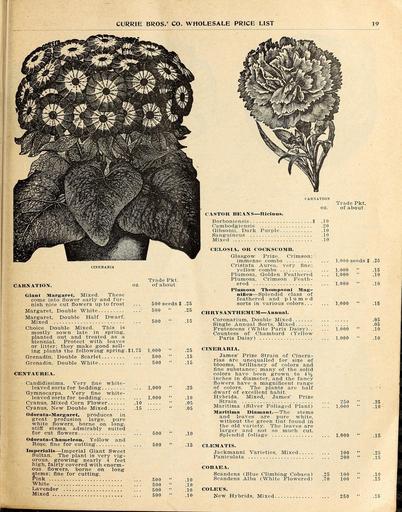 | Keywords: Wholesale price list (16187496860).jpg CURRIE BROS ' CO WHOLESALE PRICE LIST <br> 19 <br> CINKRARIA <br> CARNATION oz <br> Giant Margaret Mixed These <br> come into flower early and fur- <br> nish nice cut flowers up to frost <br> Margaret Double White <br> Margaret Double Half Dwarf <br> Mixed <br> Choice Double Mixed This Is <br> mostly sown late In spring- <br> planted out and treated as a <br> biennial Protect with leaves <br> or litter; they make good sell- <br> ing plants the following spring 1 75 <br> Grenadin Double Scarlet <br> Grenadln Double White <br> BENTAXIREA <br> Candldlssima Very fine white- <br> leaved sorts for bedding <br> Gymnocarpa Very fine white- <br> leaved sorts for bedding <br> Cyanus Mixed Corn Flower 10 <br> Cyanus New Double Mixed 15 <br> Odorata-Margaret produces in <br> great profusion large pure <br> w hite flowers borne on long <br> stiff stems admirably suited <br> for cut flowers <br> Odorata-Chameleon Yellow and <br> Rose fine for cutting <br> Imperlalis Imperial Giant Sweet <br> Sultan The plant Is very vig- <br> orous growing nearly 4 feet <br> high fairly covered with enorm- <br> ous flowers borne on long <br> stems; fine for cutting <br> Pink <br> White <br> Lavender <br> Mixed <br> Trade Pkt <br> of about <br> 500 seeds ; <br> 500 <br> 500 <br> 1 000 <br> 500 <br> 500 <br> 25 <br> 25 <br> 15 <br> 25 <br> 15 <br> 15 <br> 1 000 <br> 25 <br> 1 000 <br> 10 <br> 05 <br> 05 <br> 500 <br> 500 <br> 500 <br> 500 <br> 500 <br> 500 <br> 10 <br> CARNATION <br> CASTOR BEANS Ricinus <br> Borbonlensls 10 <br> Cambodgiensis 20 <br> Glbsonii Dark Purple 10 <br> Sanguineus 10 <br> Mixed 10 <br> CELOSIA OR COCKSCOMB <br> Glasgow Prize Crimson; <br> immense combs <br> Cristata Aurea very fine; <br> yellow combs <br> Plumosa Golden Feathered <br> Plumosa Crimson Feath- <br> ered <br> » Plumosa Thonipsoni Mag- <br> nlfica Splendid class of <br> feathered and plumed <br> sorts In various colors <br> CHRYSANTHEMUM Annual <br> Coronarium Double Mixed <br> Single Annual Sorts Mixed <br> Frutesoens White Paris Daisy <br> Countess of Chambord Yellow <br> Paris Daisy <br> CINERARIA <br> James' Prize Strain of Cinera- <br> rias are unequalled for size of <br> blooms brilliancy of colors and <br> fine substance; many of the solid <br> colors have been grown to 4i/ <br> Inches in diameter and the fancy <br> flowers have a magnificent range <br> of colors The plants are half <br> dwarf of excellent habit <br> Hybrida Mixed James' Prize <br> Strain <br> Maritlma Silver Foliaged Plant <br> Maritima Diamant The stems <br> and leaves are pure white <br> without the green tint found in <br> the old variety The leaves are <br> larger and not so much cut <br> Trade Pkt <br> of about <br> 1 000 seeds 25 <br> 1 000 <br> 1 000 <br> 1 000 <br> 1 000 <br> 1 000 <br> 1 000 <br> 15 <br> 10 <br> 10 <br> 15 <br> 05 <br> 05 <br> 10 <br> 10 <br> 250 <br> 1 000 <br> 15 <br> CLEMATIS <br> Jackmanni Varieties Mixed <br> Paniculata <br> <br> 100 <br> 200 <br> COBAEA <br> 10 <br> Scandens Blue Climbing Cobaea <br> Scandens Alba White Flowered <br> 25 <br> 70 <br> 100 <br> 100 <br> 10 <br> 10 <br> COLEUS <br> 10 <br> New Hybrids Mixed <br> <br> 250 <br> 35 <br> 10 <br> 15 <br> 25 <br> 15 <br> 10 <br> 15 <br> 15 42212816 133036 66130 Page 19 Text http //www biodiversitylibrary org/page/42212816 1905 10 5962/bhl title 66130 Currie Brothers Company ; Henry G Gilbert Nursery and Seed Trade Catalog Collection NameFound Cambodgiensis NameFound Celosia NameConfirmed Celosia L EOLID 38393 NameFound Chrysanthemum NameConfirmed Chrysanthemum EOLID 38388 NameBankID 2657422 NameFound CINERARIA NameConfirmed Cineraria EOLID 6258313 NameBankID 1674869 NameFound CINERARIA NameConfirmed Cineraria EOLID 6258313 NameBankID 4894724 NameFound CLEMATIS NameConfirmed Clematis ser Alpina W J Yang L Qian Li EOLID 38289 NameFound Cobaea NameConfirmed Cobaea EOLID 5694106 NameBankID 1778130 NameFound Coronarium NameFound Cristata NameConfirmed Cristata NameBankID 5109487 NameFound Cyanus NameConfirmed Cyanus EOLID 5112441 NameBankID 379620 NameFound Hybrida NameConfirmed Hybrida NameBankID 5327990 NameFound Maritima NameFound Paniculata NameFound Plumosa NameConfirmed Plumosa EOLID 8989422 NameBankID 4515141 NameFound Ricinus NameConfirmed Ricinus L EOLID 107750 NameFound Sanguineus Biodiversity Heritage Library Currie Bros Co Wholesale price list autumn 1905 Garden Stories Bulbs Plants Catalogs Equipment and supplies Flowers Gardening Nurseries Horticulture Plants Ornamental Seeds U S Department of Agriculture National Agricultural Library bhl page 42212816 dc identifier http //biodiversitylibrary org/page/42212816 bhlGardenStories BHLinbloom bulbs plants nurseries horticulture plants ornamental u s department of agriculture national agricultural library bhlgardenstories bhlinbloom Information field Flickr posted date ISOdate 2015-01-26 CC-BY-2 0 BioDivLibrary https //flickr com/photos/61021753 N02/16187496860 2015-08-25 05 56 57 cc-by-2 0 PD-old-70-1923 Wholesale price list Photos uploaded from Flickr by FÊ using a script |