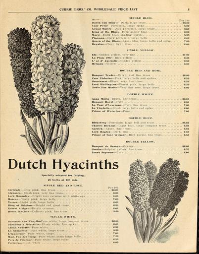 | Keywords: Wholesale price list (16373120631).jpg CURRIE BROS ' CO WHOLESALE PRICE LIST <br> SINGLE BLUE <br> ' ' -~-- I Per lOO <br> Baron van Thuyll Dark large truss 6 00 <br> Czar Peter Porcelain large spike 8 00 <br> Grand Maitre Deep porcelain large truss 6 50 <br> King of the Blues Deep glossy blue 6 00 <br> Marie Dark blue shading purple 5 35 <br> Pinenian Dark porcelain large bells 6 00 <br> Ctiieen of the Blues Azure blue large bells and spike 7 00 <br> Regulus Clear light blue 6 00 <br> SINGLE YELLOW <br> Ida Golden yellow very fine 7 00 <br> La Pluie d'Or Rich yelloTV 6 50 <br> L' or d' Australie Golden yellowy 6 50 <br> Herman Yellow 6 00 <br> DOUBLE RED AND ROSE <br> Bouquet Tendre Bright red fine truss 6 00 <br> Czar Nicholas Pink large bells and spikes 6 50 <br> Grootvorst Blush very fine truss 6 50 <br> Lord Wellington Finest pink large bells 6 50 <br> Noble Par Merite Very fine rose large truss 6 00 <br> DOUBLE WHITE <br> Anna Maria Blush fine truss 6 00 <br> Bouquet Royal Pure 6 00 <br> La Tour d'Auvergne Pure fine truss 7 00 <br> La A'irglnite Blush large bells and spike 6 00 <br> Prince of AVaterloo Pure 7 00 <br> DOUBLE BLUE <br> Bloksberg Porcelain large bell and truss 6 50 <br> Charles Dickens Light blue large compact truss 6 50 <br> Garrick Azure fine truss 6 50 <br> Lord Raglan Dark fine 7 50 <br> Prince of Saxe AVieinar Rich purple fine truss 6 50 <br> DOUBLE YELLOW <br> Bouquet de Orange Orange 6 00 <br> Goethe Sulphur yellow fine truss 6 25 <br> Jaune Supreme Pure 6 00 <br> Dutch Hyacinths <br> Specially adai tetl for forcing <br> 25 bulbs at 100 rate <br> SINGLE RED AND ROSE <br> Per too <br> Gertrude Rosy pink fine truss 6 00 <br> Gigantea Blush pink very fine truss 6 00 <br> Lord Macaulay Bright rosy carmine with white eye 6 00 <br> Moreno Waxy pink large bells 7 00 <br> Norma Light pink large bells 6 00 <br> King of Belgium Bright red good truss 6 'ยป0 <br> Robert Steiger Bright crimson 6 00 <br> Rosea Maxima Delicate pink fine truss ' 8 00 <br> SINGLE AVHITE <br> Baroness van Thuyll Pure white large compact truss 6 00 <br> Grandeur a Merveille Blush white fine spike 0 00 <br> Granfl A'edette Pure white 6 50 <br> La Grandesse Pure white large truss 8 50 <br> L'Innoccnce Pure white large 7 00 <br> Mad Van der Hoop Pure white extra large bells 7 50 <br> Paix de I'Europe Pure white large spike 6 50 <br> Voltaire Blush white 6'00 42212830 133036 66130 Page 5 Text http //www biodiversitylibrary org/page/42212830 1905 10 5962/bhl title 66130 Currie Brothers Company ; Henry G Gilbert Nursery and Seed Trade Catalog Collection NameFound Gigantea NameConfirmed Gigantea EOLID 91906 NameBankID 4549793 NameFound Maxima NameConfirmed Maxima EOLID 11600420 NameBankID 5132771 Biodiversity Heritage Library Currie Bros Co Wholesale price list autumn 1905 Garden Stories Bulbs Plants Catalogs Equipment and supplies Flowers Gardening Nurseries Horticulture Plants Ornamental Seeds U S Department of Agriculture National Agricultural Library bhl page 42212830 dc identifier http //biodiversitylibrary org/page/42212830 bhlGardenStories BHLinbloom bulbs plants nurseries horticulture plants ornamental u s department of agriculture national agricultural library bhlgardenstories bhlinbloom Information field Flickr posted date ISOdate 2015-01-26 CC-BY-2 0 BioDivLibrary https //flickr com/photos/61021753 N02/16373120631 2015-08-25 05 55 00 cc-by-2 0 PD-old-70-1923 Wholesale price list Photos uploaded from Flickr by Fรฆ using a script |