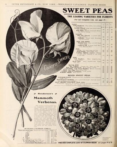| Keywords: Wholesale price list of requisites for florists and market gardeners (16589158770).jpg s <br> PETER HENDERSON CO NEW YORK WHOLESALE CATALOGUE FLOWER SEEDS <br> SWEET PEAS <br> THE LEADING VARIETIES FOR FLORISTS <br> For our Complete List see page 17 <br> Pure white very profuse <br> WHITE <br> Emily Henderson <br> flowering <br> Dorothy Eckford Large open round stand- <br> ard pure white <br> Mont Blanc Dwarf extra early flower <br> ing fine for forcing <br> YELLOW; <br> Hon Mrs K'enyon A grand prim <br> rose yellow <br> Sunbeams Dwarf early flowering <br> fine for forcing <br> ROSE AND WHITE <br> Klanche Perry Rose red with blush <br> white wings <br> Earliest of All A dwarf early flow <br> ering Blanche Ferry <br> PINK <br> Lovely Soft pink large ami fine <br> Prima Donna Pure bright pink <br> Countess Spencer Gigantic flowers <br> of shell pink shading to rose pink <br> at the edge <br> Deep magenta-rose <br> ROSE <br> Lord Roseberr\ <br> wings lighter <br> Royal Rose Deep carmine-rose wings <br> rose pink <br> ORANGE ROSE <br> Miss Wilmott Orange-rose large and fine <br> RED King Edward VII Rich crimson scarlet <br> LAVENDER Lady Orisel Hamilton Silvery lavender <br> BLUE Navy Blue Deep indigo blue <br> PURPLE Duke of Westminster Violet purple <br> MAROON Othello Dark maroon <br> MIXED SWEET PEAS <br> SUPERIOR MIXED Blended in proper proportions from exclusively <br> bright colors <br> MIXED GIANT HYBRIDS from recent Eckford and American novel- <br> tics including new seedlings <br> GIANT ORCHID FLOWERED Mixed Colors <br> Exclusively composed of Countess Spencer hybrids containing <br> blush-pink rose orange crimson eio <br> H 05 <br> 15 <br> 05 <br> 05 <br> 05 <br> 05 <br> 05 <br> 05 <br> 05 <br> 05 <br> 05 <br> Mammoth <br> Verbenas <br> This distinct and beautiful race <br> we originated introduced and <br> named '1 he average trusses meas- <br> ure 0 to 12 inches in circumlerence <br> and the individual florets on prop- <br> erly grown plants over 1 inch <br> across or larger than a 25c silver <br> piece 1 hey bloom treely are vig- <br> orous in giowth and contain beau- <br> ti id new colors and shades For <br> beas and massing these <br> s are unrivaled; flowers of <br> iant colors produced <br> m spring until late <br> l Although peren- <br> rrn luxuriant plants <br> and bloom the first season lioffi <br> seed ' <br> the r <br> ri nt i <br> in th <br> nials these <br> HENDERSON S MAMMOTH VERBENA <br> Henderson's choicest <br> Wamn oth mixed color <br> strain <br> white <br> scarlet <br> purple <br> pink <br> salmon <br> yellow new cream yellow <br> i auricula eyed large white eyes- <br> t Aurora Borealis blood scarlet <br> Commandante Marechand garnet <br> pkt <br> II IIO <br> 10 <br> 20 <br> 75 <br> 25 <br> loo <br> 10 <br> 25 <br> 1 00 <br> 10 <br> 25 <br> 1 1' <br> 10 <br> 25 <br> 1 00 <br> 1 1 <br> 15 <br> 30 <br> 1 6i <br> 10 <br> 25 <br> 1 00 <br> 15 <br> 50 <br> 3 00 <br> 15 <br> 50 <br> lb <br> 15 <br> 15 <br> 15 <br> 15 <br> 25 <br> 15 <br> 15 <br> 10 <br> 15 I <br> ; <br> 10 <br> lb <br> ÂŤ <br> 30 <br> 30 <br> 30 <br> 50 <br> 30 <br> 30 <br> 30 <br> 30 <br> 1 50 <br> 30 <br> 30 <br> 30 <br> 40 <br> 30 <br> 30 <br> 30 <br> 30 <br> 40 <br> I 50 <br> HENDERSON <br> MAMMOTH <br> VERBENA <br> F08 OUR COMPLETE LIST OF FLOWER SEEDS see pages 9 to 17 45173703 160879 84546 Page 8 Text http //www biodiversitylibrary org/page/45173703 1908 Henderson Peter Co ; Stumpp Walter Co New York N Y Biodiversity Heritage Library Wholesale price list of requisites for florists and market gardeners / 1897-1913 Garden Stories Catalogs Henderson Peter Co New York New York State Nurseries Horticulture Nursery stock Seed industry and trade Seeds Stumpp Walter Co New York N Y Mertz Library The New York Botanical Garden bhl page 45173703 dc identifier http //biodiversitylibrary org/page/45173703 bhlGardenStories Flowers Bulbs Vegetables Sweet Peas Verbena BHLinbloom henderson peter co new york new york state nurseries horticulture stumpp walter co new york n y mertz library the new york botanical garden bhlgardenstories sweet peas bhlinbloom Information field Flickr posted date ISOdate 2015-03-10 CC-BY-2 0 BioDivLibrary https //flickr com/photos/61021753 N02/16589158770 2015-08-24 21 51 04 cc-by-2 0 PD-old-70-1923 Verbena Wholesale price list of requisites for florists and market gardeners 1908 Photos uploaded from Flickr by FĂŚ using a script |