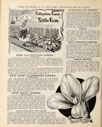 | Keywords: Wholesale price list of requisites for florists and market gardeners (16775431562).jpg PETER HENDERSON CO NEW YORK WHOLESALE LIST OF PLANTS <br> NEW LILLIPUTIAN CANNA <br> LITTLE GEM <br> A remarkable variety which we introduced last year It makes a compact lit- <br> tle clump of handsome green leaves surmounted by a wealth of brilliant orange- <br> scarlet flowers each petal lightly edged with brilliant yellow The sheath and <br> standard are also a brilliant yellow and the base of the lower petal is blazed with <br> the same color up to the point where it recurves In freedom of bloom it is re- <br> markable Plants form trusses early in the season and from the appearance of <br> the first flower until frost is a mass of color <br> The growth is its distinctive feature The extreme height from ground to tip <br> rarely exceeds two feet so that its value for edging for centres of low beds for <br> planting in herbaceous borders or for pot culture is almost beyond computation <br> See cut Price dormant roots up to April ist 1 25 per doz 10 00 per no <br> Growing plants after April ist 2 00 per doz 15 00 per ico <br> NEW GIANT-FLOWERING CANNA <br> PENNSYLVANIA <br> This is the only pure deep red flowering sort in the Giant flowering <br> Canna The flowers are often seven to eight inches across with petals two <br> and a half inches broad borne in splendid branching spikes plants six to <br> seven feet high A tremendous bloomer begins quickly and will <br> produce double the number of flowers of any other of the Giant-flow- <br> ering Cannas Leaves deep green of grand size and proportions <br> Its grand size pure deep scarlet color and profuse blooming habit <br> place it at the head of Giant-flowering Cannas to date It has no <br> equal Price dormant roots up to April ist 2 50 per doz Growing <br> plants ready April ist 3 50 per doz <br> NEW GIANT CANNA <br> /IRS KATE GRAY <br> A robust grower attains a height of six to seven feet <br> broad massive glossy green foliage Flowers a rich <br> shade of orange-scarlet marbled with intense coppery <br> red; yellow in the throat They measure from six to <br> seven inches across individual petals often being over <br> two inches wide The habit of the plant size of truss <br> and individual flower together with its superb coloring <br> make this one of the most desirable of all Price dor- <br> mant roots up to April ist 2 no per doz 15 00 per 100 <br> Growing plants ready May ist 3 00 per doz 20 00 <br> per 100 <br> CANNAS IN QUANTITY FOR HASS1NG <br> For the convenience of those who are at a loss what varieties to select <br> we make a special offer of the best sorts in separate colors If desired <br> we will select tall medium and low-growing varieties for arrangement <br> in beds We offer the following colors crimson pink orange-scarlet <br> yellow-spotted white red with yellow edge scarlet carmine purple <br> all with green foliage We will also supply in quantity dark-leaved varieties so useful <br> for massing in contrasting with the others Price dormant roots up to April ist 3 50 <br> per 100 3 00 per 1000 Growing plants ready April ist 7 00 per 100 60 00 per <br> 1000 25 sold at ico rate 250 at 101 o rate By express only purchaser to pay charges <br> The Striped Canna GOV ROOSEVELT <br> An entirely new and distinct variety; instead of <br> being mottled or spotted it is itriped The varia- <br> tion in the striping is remarkable in the highest <br> degree In some petals the coloring matter runs <br> in even bands of red and yellow others on the <br> same stem will be all red some flowers will be en- <br> tirely red and even some spikes will have only a <br> small proportion of yellow coloring while the <br> others on the same plant will show remarkable <br> variegation Dormant roots Price 1 00 per doz <br> 8 00 per 100 Growing plants ready April ist <br> 1 50 per doz 12 00 per 100 <br> ITALIA <br> The coloring is gorgeous in the extreme rich <br> golden yellow with great patches of brilliant red- <br> dish crimson and irregular spots of the same <br> shade on the upper petals It surpasses even an <br> orchid in color effects Price dormant roots <br> up to April ist 1 00 per doz 8 00 per 100 <br> Growing plants ready April ist 1 50 per doz <br> 12 00 per 100 <br> mixf; meriene lvmbahd <br> A new French variety of great merit The only <br> white Canna previous was Alsace; this new sort is <br> a decided improvement on it The color of the <br> flowers at their best is a glistening snow white <br> The individuals flowers and petals are fully one- <br> third larger than Alsace It is a taller grower <br> and of a more graceful spreading habit Taken <br> altogether it is a very distinct and meritorious var- <br> iety See cut Price dormant roots up to April <br> ist 25c each 2 25 per doz Growing plants <br> ready April ist 35c each 3 50 per doz <br> BLACK BEAUTY <br> A majestic stately variety straight as an In- <br> dian with large massive foliage of the richest <br> bronzy purple color shaded with black the edges <br> of leaves gracefully undulating Where foliage <br> effect alone is desired nothing richer or more <br> handsome can be found Price dormant roots <br> up to April ist 1 50 per doz n co per 100 <br> Growing plants ready April 1st 2 50 per doz <br> 20 00 per 100 <br> salmon 45174330 160879 84546 Page 6 Text http //www biodiversitylibrary org/page/45174330 1902 Henderson Peter Co ; Stumpp Walter Co New York N Y Biodiversity Heritage Library Wholesale price list of requisites for florists and market gardeners / 1897-1913 Garden Stories Catalogs Henderson Peter Co New York New York State Nurseries Horticulture Nursery stock Seed industry and trade Seeds Stumpp Walter Co New York N Y Mertz Library The New York Botanical Garden bhl page 45174330 dc identifier http //biodiversitylibrary org/page/45174330 bhlGardenStories Flowers Bulbs Vegetables Canna Lily BHLinbloom henderson peter co new york new york state nurseries horticulture s