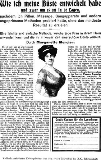 Keywords: Wie ich meineBuste entwickelt habe.gif Wie ich meine Büste entwickelt habe und zwar um 15 cm in 30 Tagen nachdem ich Pillen Massage Saugapparate und andere angepriesene Methoden probiert hatte ohne das mindeste Resultat zu erzielen Eine leichte und einfache Methode welche jede Frau in ihrem Heim anwenden kann und die ihr in kurzer Zeit eine Schöne Büste verleiht Durch Margarette Mercier Es ist mir nur zu gut bekannt wie entsetzlich und beschämend es ist eine flache Büste zu besitzen und ein Gesicht mit männlichen Formen zu haben Es lässt sich deshalb auch kaum mit Worten aus- drücken was ich empfand und welche Last von meinem Herzen fiel als ich sah dass der Umfang meiner Büste um 15 cm zugenommen hatte Ich fühlte mich wie neugeboren denn ich war mir wohl bewusst dass ich ohne Büste weder Frau noch Mann war sondern ein Zwischending der beiden Geschlechter Welche Geringschätzung muss jeder Mann empfinden beim Anblick einer Frau mit einer ebenso flachen Büste wie seine eigene Kann eine solche Frau jene Erregung und Ge- mütsbewegung einflössen wie sie nur eine wirkliche Frau eine Frau die eine schöne runde Büste besitzt hervorbringen kann Gewiss nicht Die gleichen Männer die mich Vorher gemieden haben und die gleichen Frauen die mir ihre Geringschätzung gezeigt haben so lange ich noch ganz flach und obne Büste war wurden kurze Zeit nachher als ich diese wunder ¢ bare Entwicklung der Büste erzielt hatte meine eifrigsten Verehrer Dadurch kam ich auf den Ge-danken dass alle Frauen denen eine schöne Büste versagt ist von meiner zufälligen Entdeckung profi- tieren könnten und dadurch eine ähnliche Büste wie die meinige erzielen werden Ich war vorher durch Schwindler aller Art betrogen worden welche mir die verschiedensten Drogen und Apparate zur Entwicklung der Büste verkauften die mir aber nicht den geringsten Nutzen brachten Ich beschloss des-halb meine unglücklichen Mitschwestern nicht mehr länger durch diese Betrüg er bestehlen zu lassen und warne damit jede Frau sich denselben anzuvertrauen Die Entdeckung dieses einfachen Verfahrens dank welchem ich meine Büste in 30 Tagen um 15 cm vergrössert habe ist einem einfachen Zufall zuzu- schreiben ohne Zweifel durch die Vorsehung herbei- geführt Da mir aber die Vorsehung in ihrer Güte das Mittel gab eine entzückende Büste zu erzieien so fühle ich mich verpflichtet das Geheimnis meinen Mitschwestern welche dasselbe benötigen mitzuteilen Senden Sie einfach eine 20 Pfg - Marke und Sie werden mit umwen- dender Post alle Auskünfte erhalten Ich leiste ausdrückliche und un-bedingte Garantie dass jede Frau im Verlauf von 30 Tagen eine gross-artige Entwicklung der Büste er- zielen wird und dass diese Methode sehr leicht im eigenen Heim ange- wandt werden kann ohne dass die intimsten Freundinnen auch nur das Geringste bemerken A dressieren Sie alle Korrespondenz an das Institut Venus Carnis A Hocquette pharmacien de prem classe 17 Boulevard de la Made- leine Paris Division 91 A PS Es ist ratsam dass jene Damen welche eine schöne Büs te erzielen wollen sofort schreiben denn obige 'Offerte ist ein ehren- haftes aufrichtiges Angebot das dem Wunsch entspringt Gutes zu tun Mme Mercier gewinnt ab- solut nichts durch diesen Ausgleich sondern bietet vollständig gratis ihre Hilfe und ihre Ratschläge an Damen welche befürchten dass dis Büste vielleicht einen zu grossen Umfang erhalten könnte diene zur Nachricht dass man sofort mit der Anwendung des Verfahrens aussetzen muss wenn die Büste den ge- wünsch ten Grad von Entwicklung erzielt hat Briefe sind mit 20 Pfennig zu frankieren Gratis-Coupon für die Leserinnen welcher die Einsenderin berechtigt vollständige Auskünfte über diese neue und wanderbare Entdeckung zur Entwicklung und Verschönerung der 8üste Zu erhalten Schneiden Sie diesen Cou on heute noch aus und senden Sie ihn mit Ihrem Namen und Ihrer vollständigen Adresse versehen an A Hocquette Division 91 A 17 Boulevard de la Madeleine Paris und fügen Sie dem Coupon eine 20 Pfg -Marke f ür die Antwort bei Frau od Fräul Strasse u Nummer Stadt oder Ort Staat Vielfach verbreitetes Zeitungsinserat aus dem ersten Jahrzehnt des XX Jahrhunderts Sittengeschichte des Intimen page 115 PD-old Chest expanders History of brassieres Transcutaneous electrical nerve stimulation |